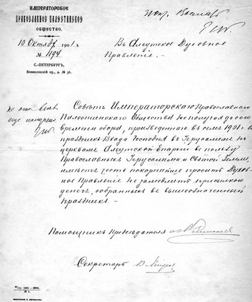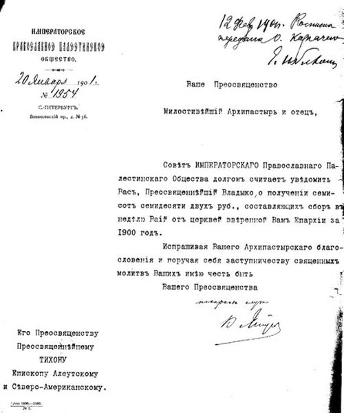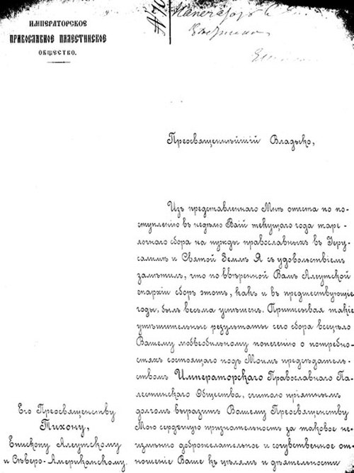 Сохранились документы, отражающие переписку Совета ИППО, самого Председателя ИППО великого князя Сергея Александровича с будущим Патриархом, тогда еще епископом Алеутским и Аляскинским (с 1898 г.), позднее Алеутским и Североамериканским (1900–1907 гг.) по поводу сборов пожертвований в пользу Палестинского Общества, т.н. "вербного" сбора.