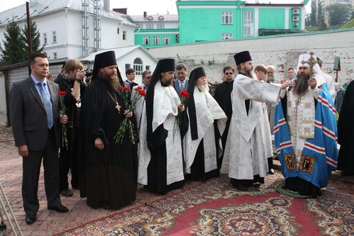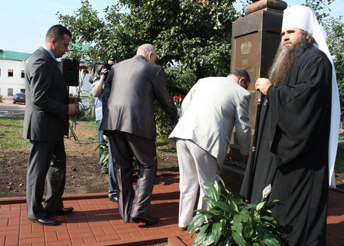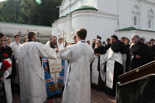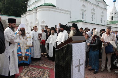 Под пение тропаря празднику Преображения Господня Высокопреосвященный Георгий митрополит Нижегородский и Арзамасский торжественно прошествовал к месту освящения памятника. Высокопреосвященный Владыка Георгий окропил памятник святой водой во имя «Отца и Сына и Святого Духа».