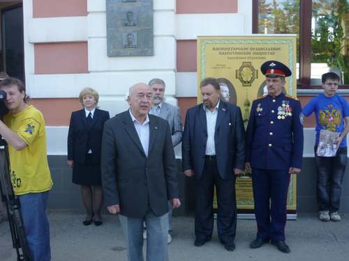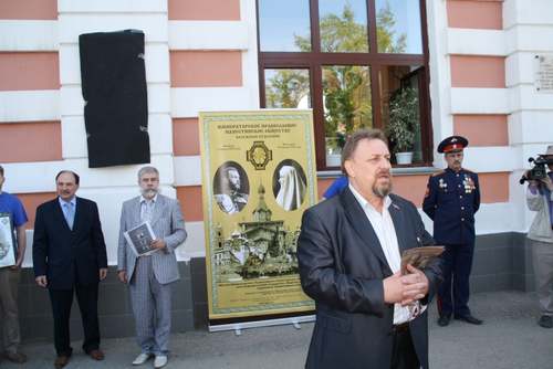 Затем выступил Владимир Борисович Серебренников, действительный член Петровской академии наук, член Ученого Совета РГО, который обратил внимание присутствующих на то, что роль такого достойного человека как Великий Князь Михаил Александрович до конца не изучена. Теперь эта мемориальная доска напомнит, что с Императором Николаем II и Великим Князем Сергеем Александровичем приезжал младший брат Николая II Великий Князь Михаил Александрович.