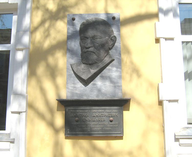Дмитрий Дмитриевич Смышляев (1828–1893) - известный общественный деятель, историк. Он был первым председателем губернской земской управы (1870–1879), первым уполномоченным в Иерусалиме и почетным членом Императорского Православного Палестинского Общества, Уральского общества любителей естествознания, а также ряда других обществ. Кавалер многих орденов, в том числе такого редкого, как орден Гроба Господня.