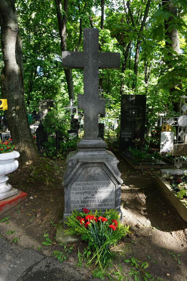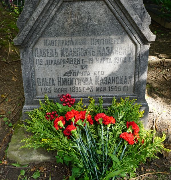 Среди них выделяется погребение с большим каменным крестом на могильном камне. На камне написано: «Кафедральный протоиерей Павел Иванович Казанский (12 декабря 1828 года – 19 марта 1908 года) и супруга его Ольга Никитична Казанская (23 июня 1835 года – 3 мая 1906 года)». Ольга Никитична была племянницей Высокопреосвященного митрополита Филарета, дочерью его родного брата Никиты Михайловича Дроздова (1799-1839).