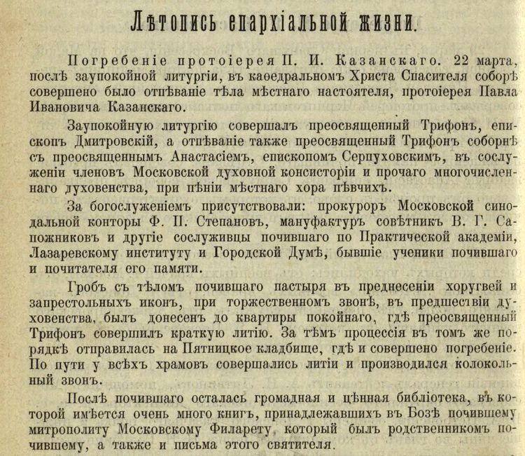 Пятницкое кладбище в Москве - место захоронения члена ИППО протоиерея Павла Казанского