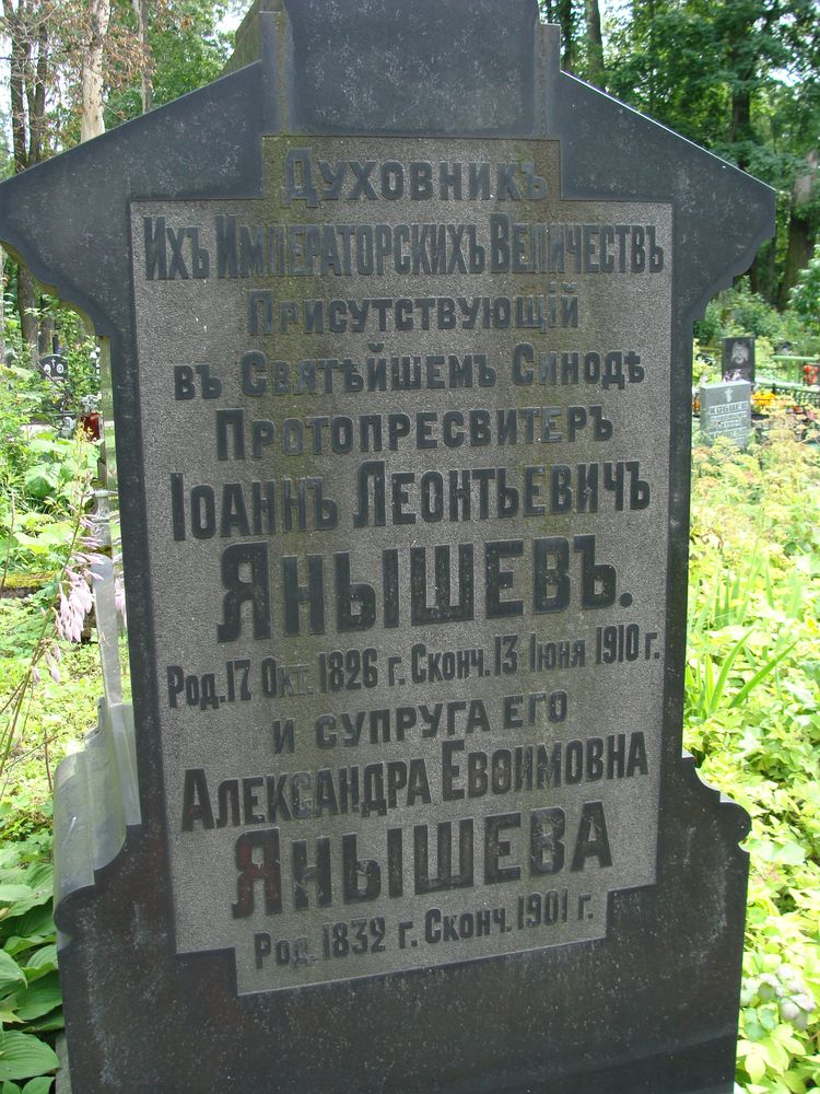 Отец Иоанн Леонтьевич Янышев отошел ко Господу 13 июня 1910 года на даче придворного ведомства на Елагином острове.
