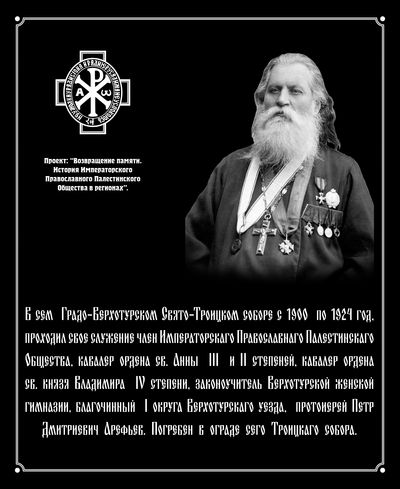 3 сентября 2015 года в рамках проекта «Возвращение памяти. История Императорского Православного Палестинского Общества в регионах» по инициативе членов Императорского Православного Палестинского Общества, представляющих благотворительный фонд «Возрождение культурного наследия» и Нижегородский Вознесенский Печерский монастырь, в Верхотурье была увековечена память членов-сотрудников дореволюционного Екатеринбургского отдела Императорского Православного Палестинского Общества - настоятеля Верхотурского Свято-Троицкого собора протоиерея Петра Дмитриевича Арефьева и настоятеля Верхотурской Знаменской церкви священника Петра Матвеевича Торопова. Проект «Возвращение памяти...» подразумевает поиск сведений о дореволюционных членах ИППО, мест их захоронений, увековечивание их памяти.