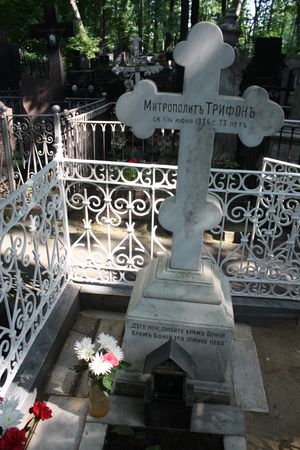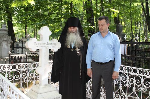 Цветы были возложены и на могилу действительного члена ИППО митрополита Трифона (Туркестанова). Владыка Трифон был долгие годы близок к Великой Княгине Елисавете Феодоровне и чтил память убиенного ее супруга. Архимандрит Тихон (Затекин) помолился об упокоении Высокопреосвященного Трифона (Туркестанова) и пропел «Со святыми упокой».