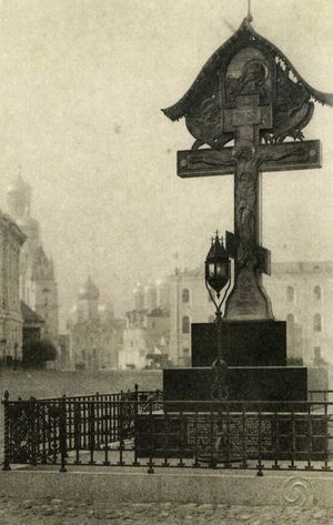 2 апреля 1908 года в Московском Кремле на месте гибели Великого Князя был торжественно освящен удивительный монумент: бронзовый крест с эмалью и изображением Распятия и Скорбящей Божией Матери на трехступенчатом постаменте из темного лабрадора. Высеченная надпись гласила, что он поставлен в память об убитом на этом месте Великом Князе Сергие Александровиче. Крест был освящен в присутствии Ее Высочества митрополитом Московским и Коломенским Владимиром (Богоявленским), председателем Московского отдела ИППО, при сослужении действительных членов ИППО: епископов Трифона (Туркестанова), Анастасия (Грибановского) и духовника Великого Князя протоиерея Константина Зверева — уполномоченного ИППО в Москве, пожизненного действительного члена ИППО с 19 мая 1894 года.