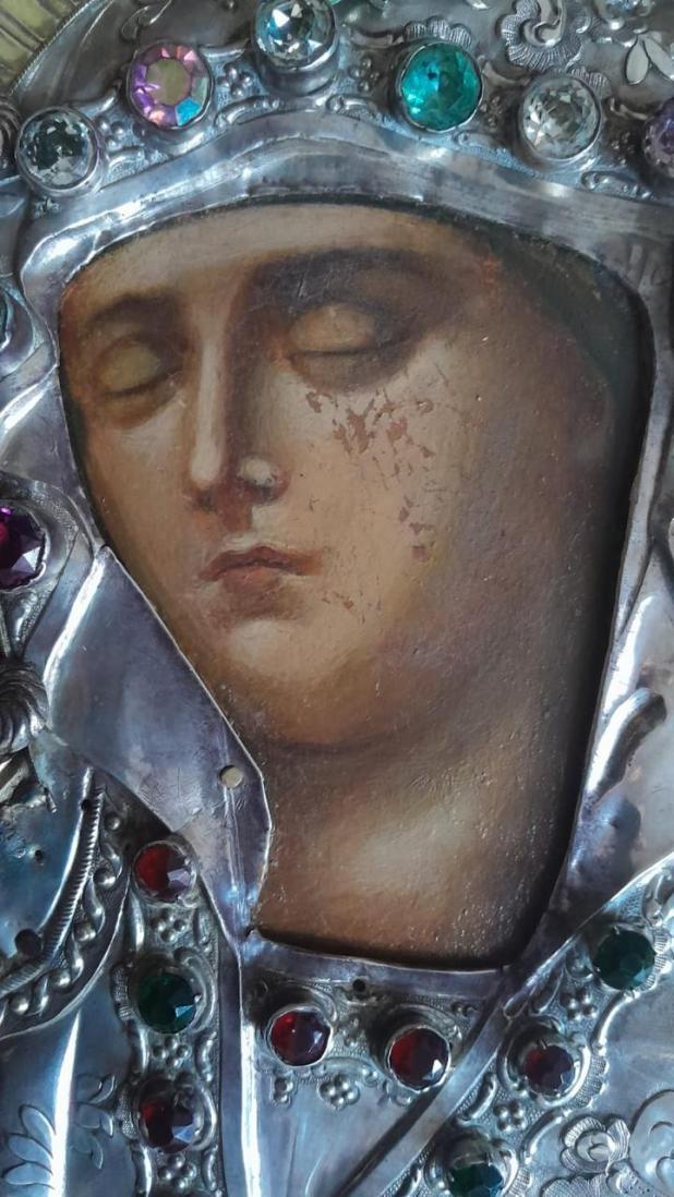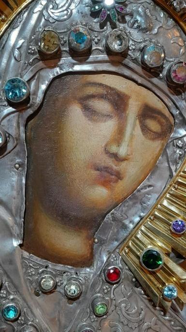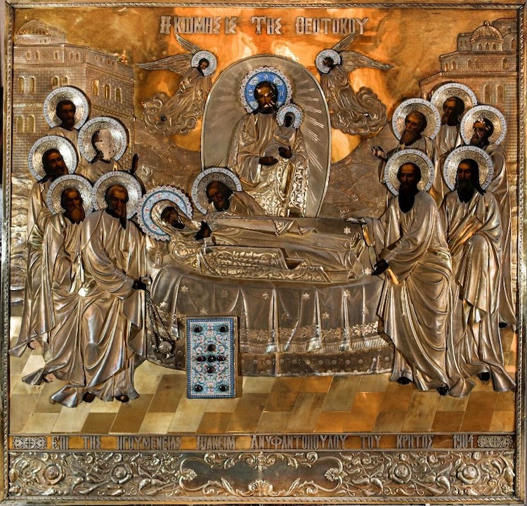 Такой значимой реликвией, самой древней из сохранившихся икон в Гефсимании – в Гробнице Пресвятой Богородицы, является спасённая в мае нынешнего года реставратором высшей категории Александром Анатольевичем Горматюком и попечением руководства Фонда Архистратига Божия Михаила, икона Успения Богоматери Киево-Печерская, убранная великолепным серебряным окладом с эмалевыми сегментами и драгоценными камнями.