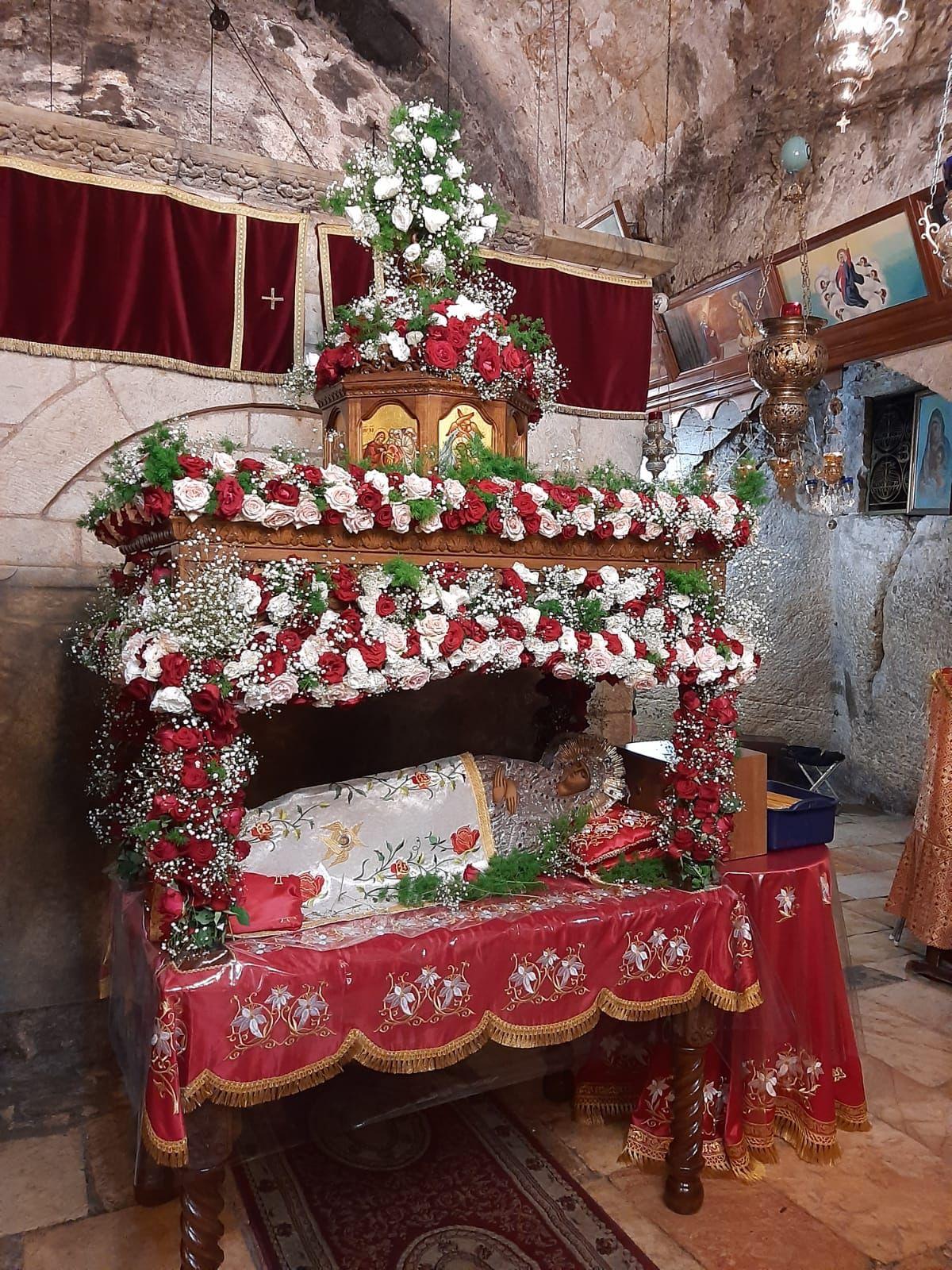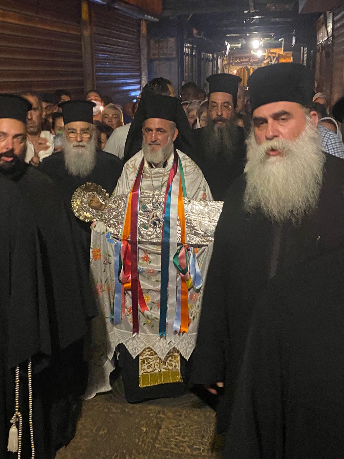 Иерусалимская плащаница Пресвятой Богородицы постоянно пребывает в Малой Гефсимании – в подворье Гефсиманской обители, напротив входа в Храм Гроба Господня. И только в дни богослужений праздника Успения Богоматери крестным ходом святыня переносится в Гефсиманию, символизируя погребальную процессию, совершаемую Апостолами.