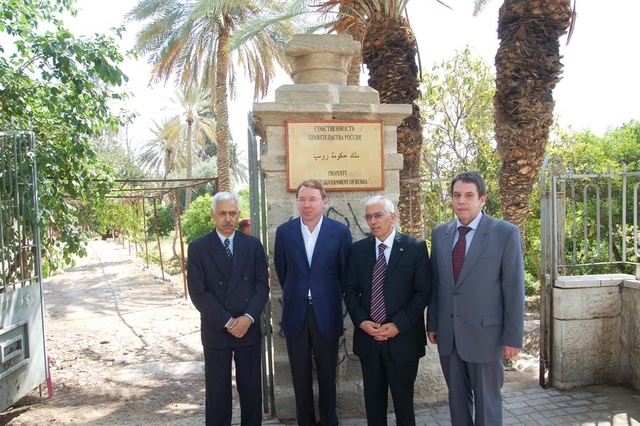 У входа на российский участок в Иерихоне слева направо: мэр Иерихона Х. Салех, управляющий делами Президента Российской Федерации В.И Кожин, губернатор Иерихона К. Хамид и представитель России в Палестинской Национальной Администрации С. Г. Козлов.