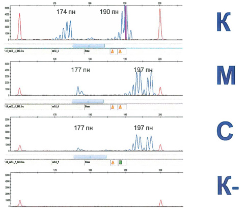 Аналогичная картина имела место и при использовании маркеров МFСЗ (по 2 одинаковых максимума на уровне 105 и 110 пн у молодой смоковницы и Смоковницы Закхея), МFС5 (по 3 одинаковых максимума на уровне 123, 131 и 140 пн), Fsус06 (по 2 одинаковых максимума на уровне 190 и 196 пн). Маркер МFС7 не обеспечивал воспроизводимую амплификацию на исследуемых образцах.