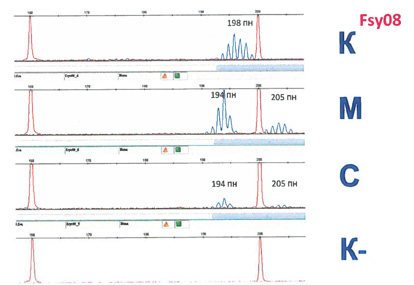 При использовании маркера Fsy08 амплифицируемые продукты у образцов Смоковницы Закхея и молодой смоковницы совпадали по размеру и имели по 2 максимума на уровне 194 и 205 пар нуклеотидов (рис. 3). У контрольного образца Ficus carica L. размер амплифицируемого продукта отличался от образцов смоковницы и имел 1 максимум 198 пн.