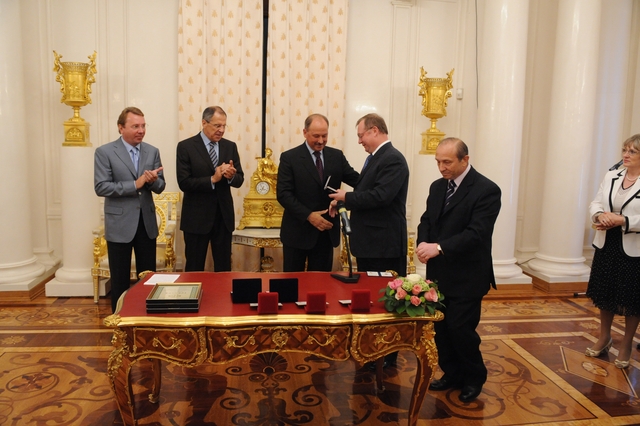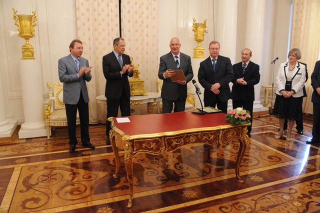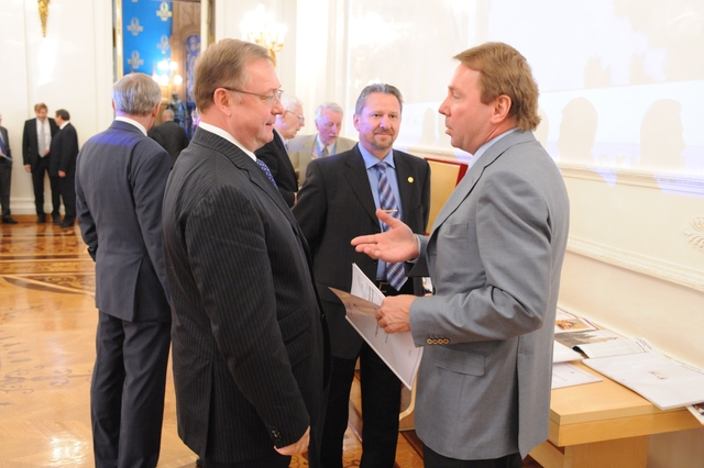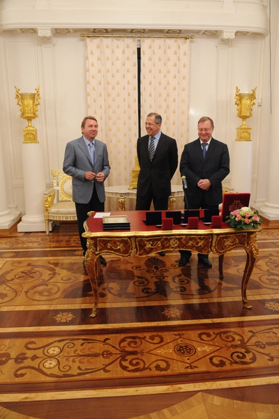 ![]() ![]() ![]() Выступление с приветственным словом. Слева направо: Управляющий делами Президента Российской Федерации В. И. Кожин, Почетный член ИППО, Министр иностранных дел Российской Федерации С. В. Лавров, Председатель ИППО, Председатель Счетной палаты Российской Федерации С. В. Степашин |