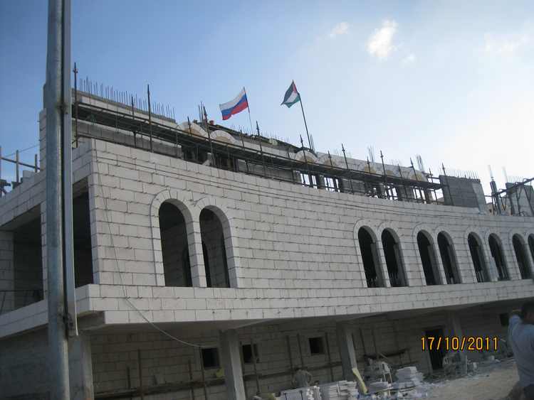| Информационные щиты на арабском и русском языке, установленные на стройплощадке |