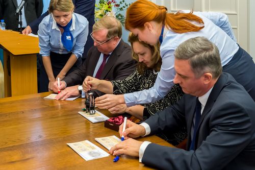 Далее Председатель Императорского Православного Палестинского Общества Сергей Вадимович Степашин, Руководитель Федерального агентства связи Олег Геннадьевич Духовницкий, Председатель Наблюдательного совета фонда "Елисаветинско-Сергиевское просветительское общество" Анна Витальевна Громова приступили к процедуре гашения. Они сделали оттиск штемпелем на нескольких блоках и подписали конверты.