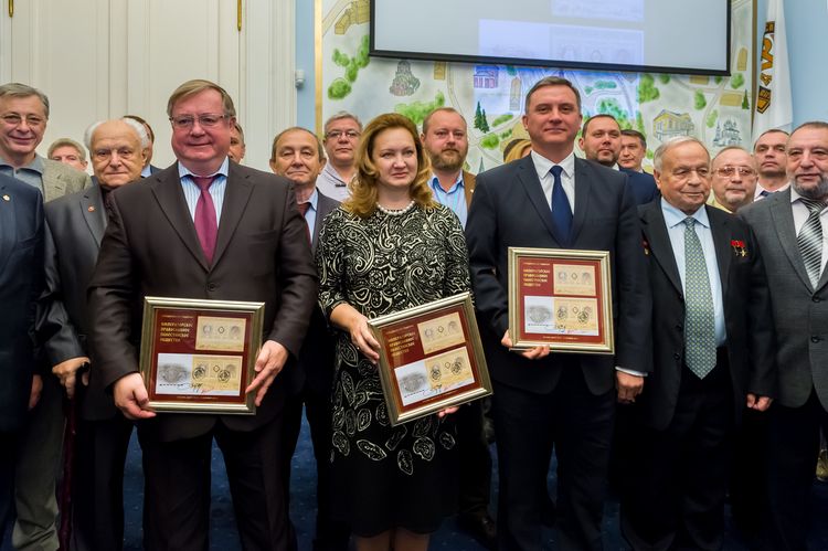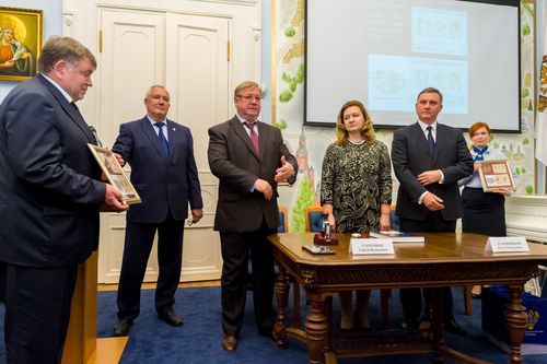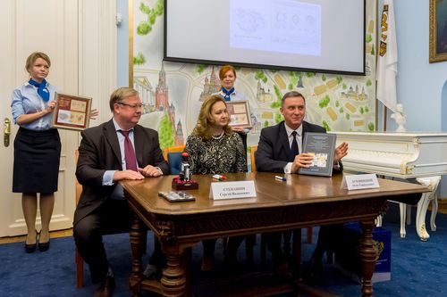 На память о церемонии Олег Духовницкий подарил для библиотеки ИППО восьмитомное издание отечественного каталога «Государственные знаки почтовой оплаты», включившее в себя описание почтовых марок, блоков, листов с оформленными полями, малых листов, буклетов, цельных вещей, а также марок, не поступивших в почтовое обращение, и охватившее эмиссионный период с 1845 по 2012 годы.